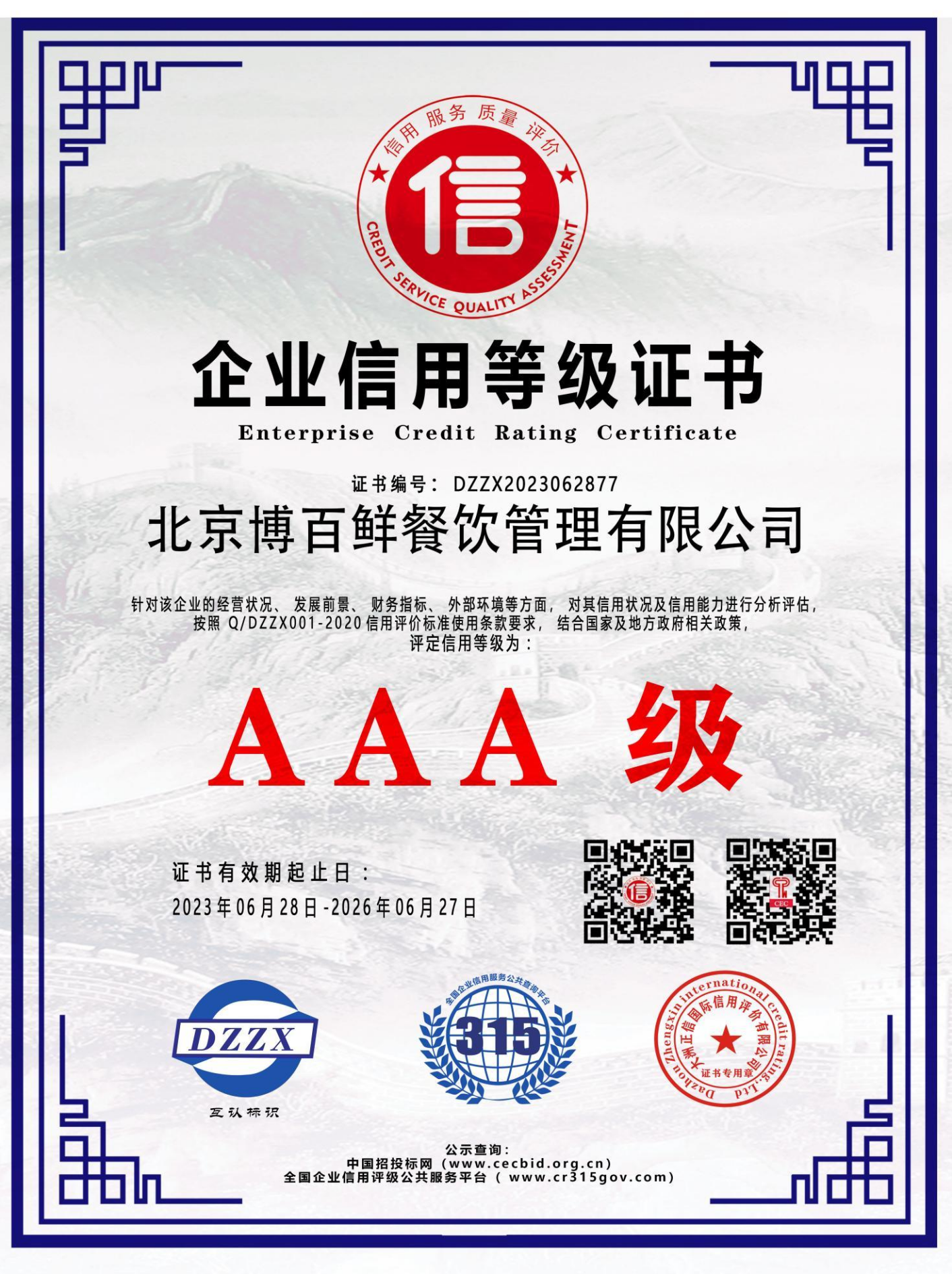AAA级资信等级证书