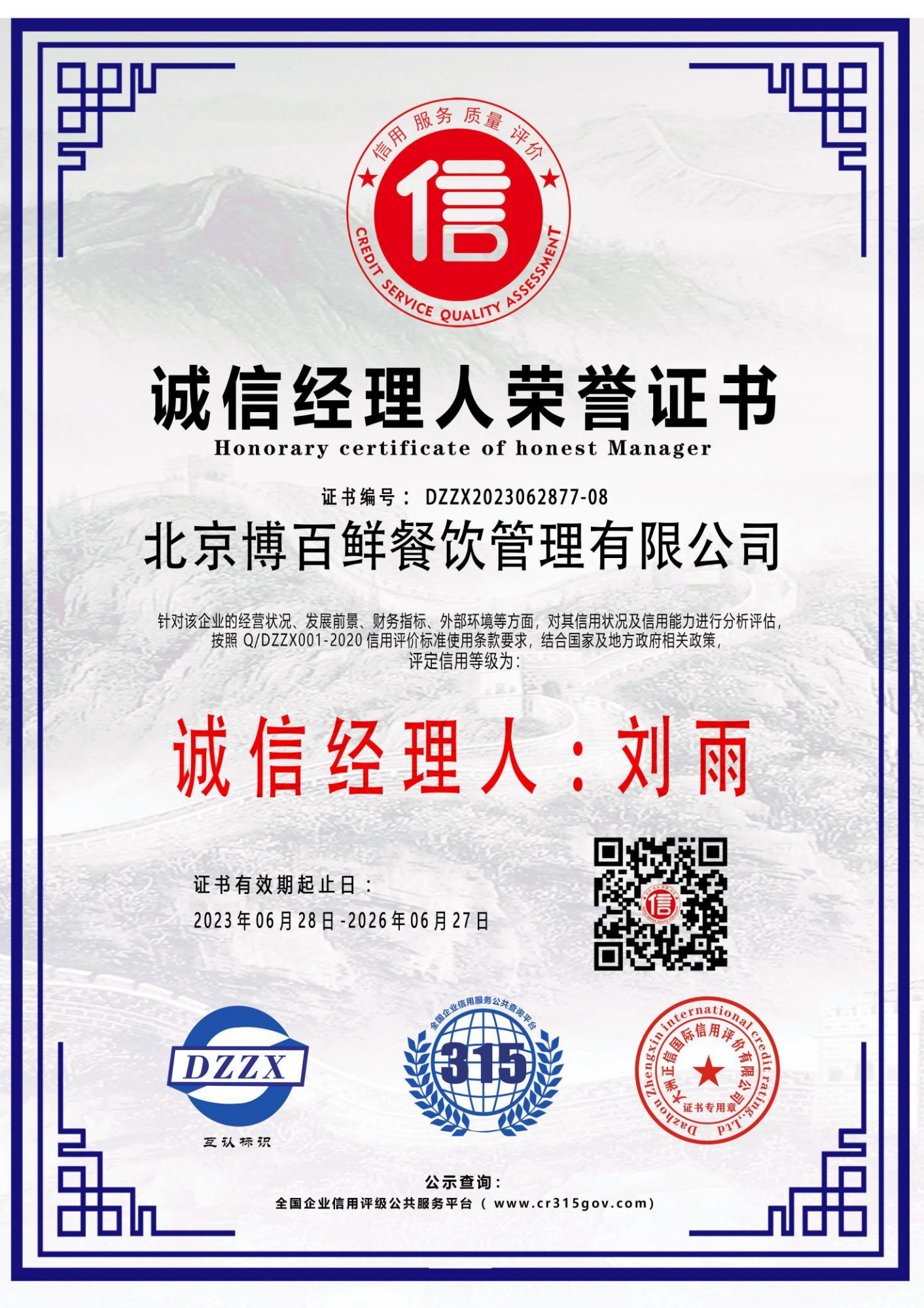 AAA级诚信经理人荣誉证书